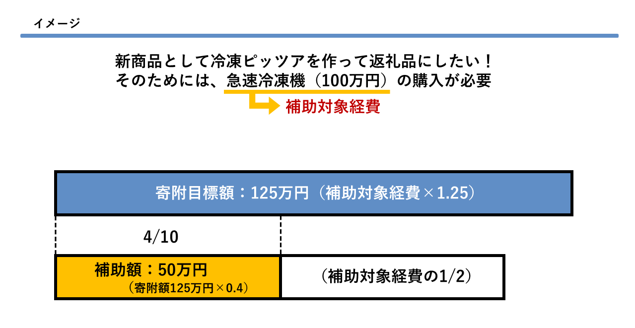 ◆CF等による寄附額の10分の4が、ふるさと産品の創出に係る必要経費のうち補助対象となる経費(以下「補助対象経費」という。)の2分の1に達した場合、補助金を交付します。(=