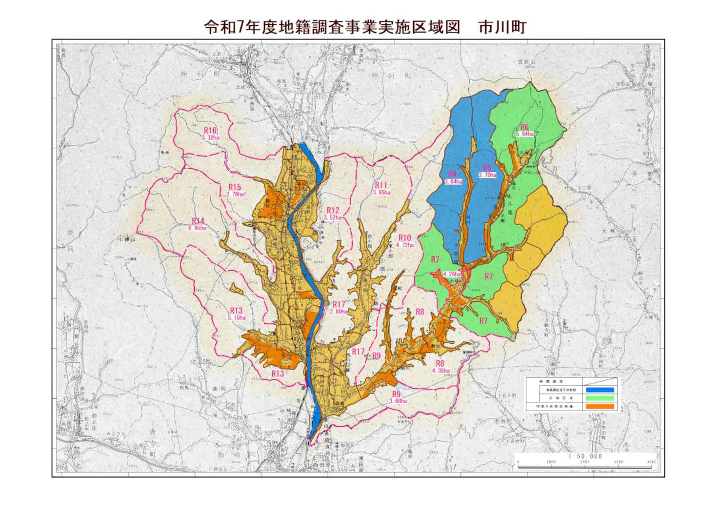 令和6年度末時点で市川町の地籍調査の進捗は、全体面積81.27㎢に対して、地籍調査実施面積が35.39㎢で全体進捗率43.5%となっています。